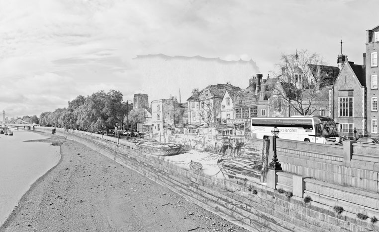 There he found the places where Whistler created his etchings and took photographs of the current situations: contemporary buildings, vehicles, ships, or people in modern clothing. In the newly created works, Masuyama has superimposed the current views of these places over Whistler’s historical prints. They reveal how significantly the Thames embankment, for example, has developed over the past 150 years, and how minor the changes in the Italian lagoon city have been in comparison. As in earlier works, Masuyama once again visualizes his main theme here, which has run through his artistic work since 1997: the connection of space, time, and change.